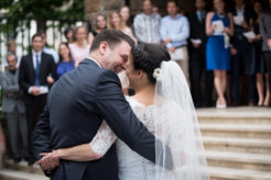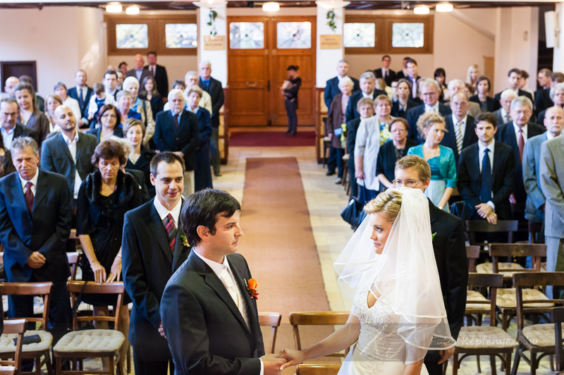 Daniról a templomban kiderült, hogy szereti váratlan kihívásokkal meglepni a fotóst (is)… :) Van ugyanis a képek között egy, ami csak annak lehet meglepő, aki velünk egy gyülekezetben nőtt fel, és sok pasaréti esküvőt látott – a csók valahogy nem a megszokott liturgia része. Mivel sokadszor fotóztam már itt, (elvileg) tudva, mikor mi következik, épp a templom hátuljában sétálgattam egy viszonylag nagylátószögű objektívvel, készülve az áldás utáni kivonulásra, amikor Géza megemlítette, hogy akkor most jöjjönamimégnemvolt… még megijedni sem volt időm, de magam sem tudom hogyan, az alábbi történelmi pillanat rákerült a kártyára, bizonyítékom van róla. :))